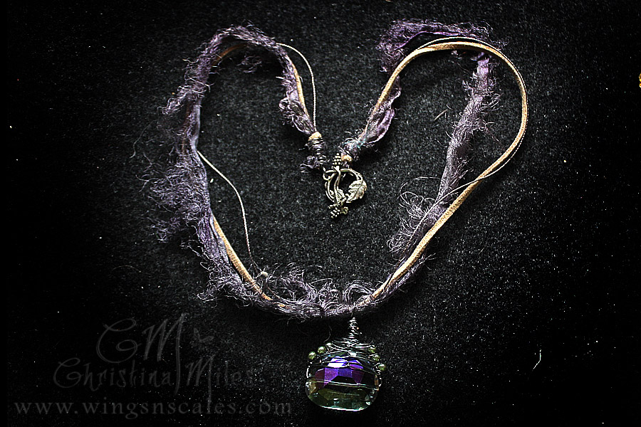 I actually made another necklace with this bead, but I didnt like how it was turning out. So I decided to do a little wire wrapping. My sister told me that she has seen lots of women wearing necklaces with just one little piece dangling, so this is my version of just one simple pendent. I like how it feels when wearing it too. Soft...LOL This is Sari silk which I bought from Divinity Fibers on Etsy.